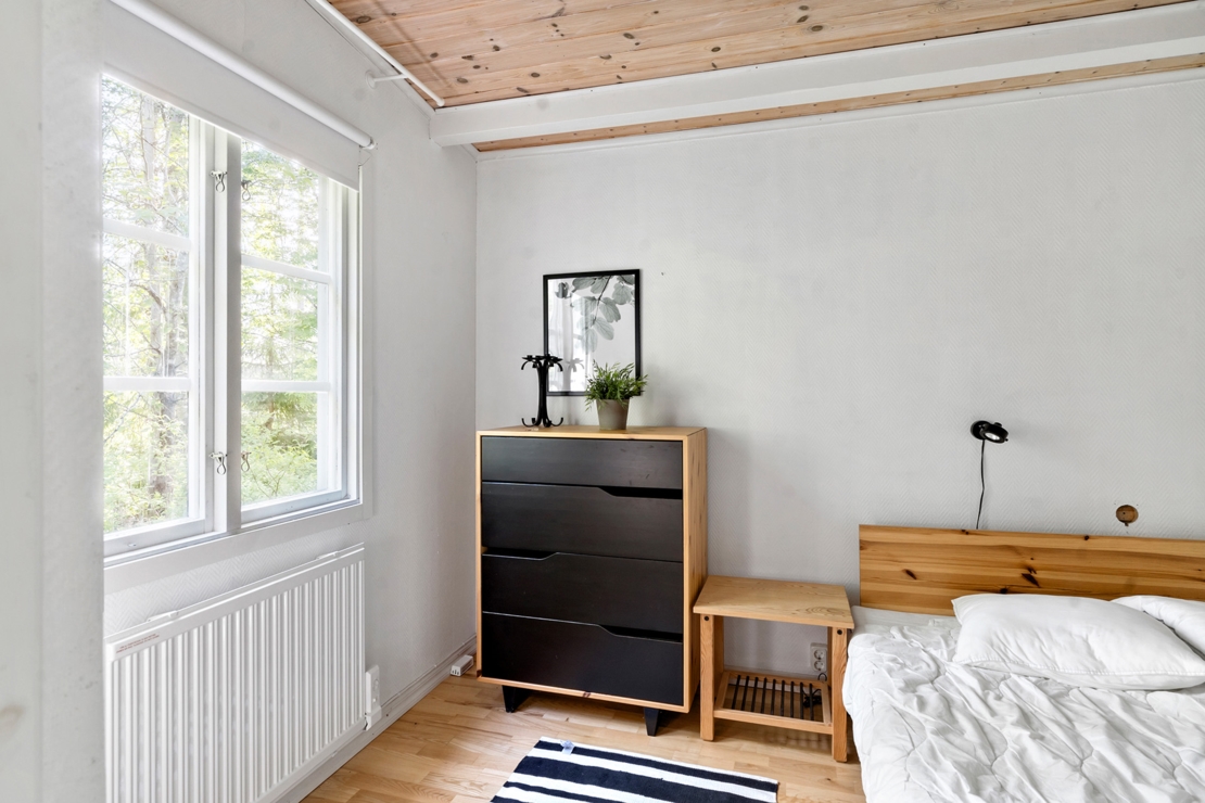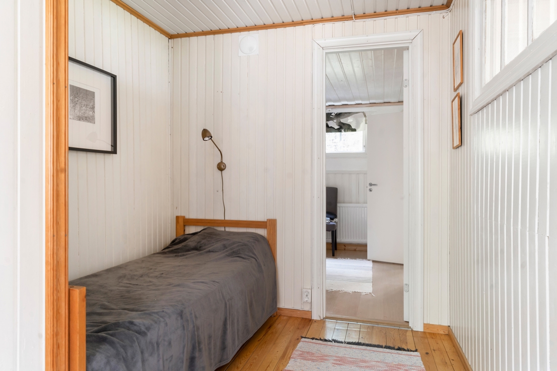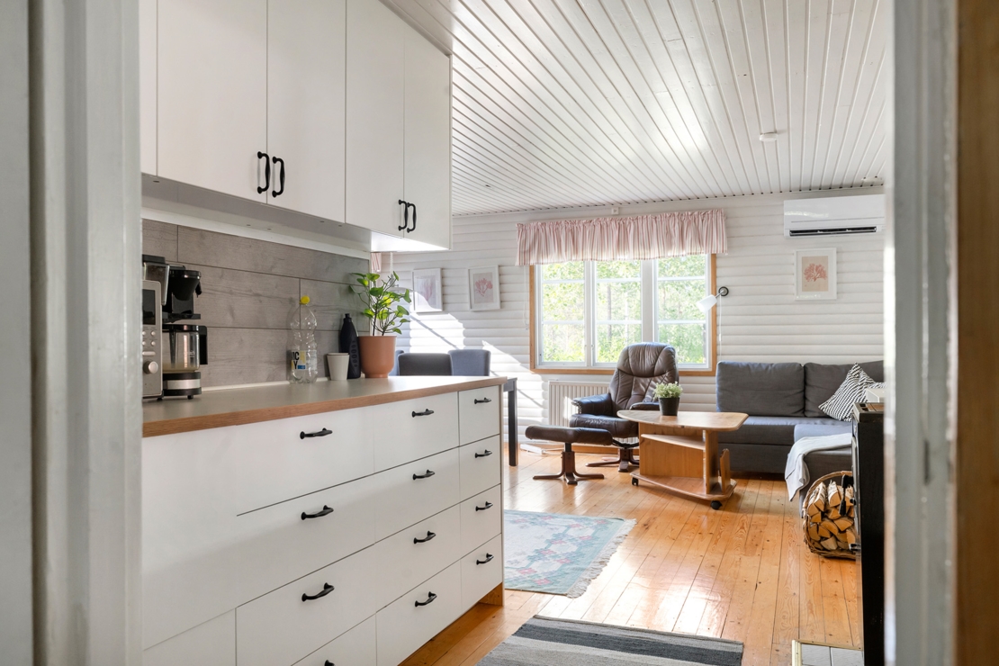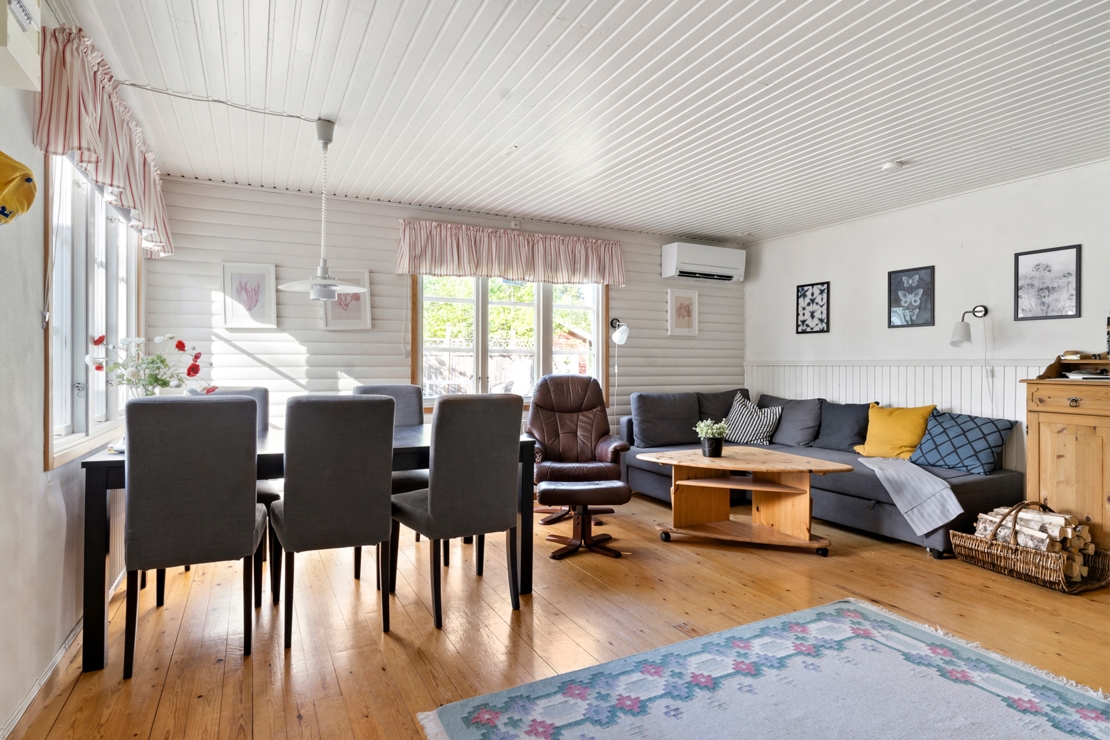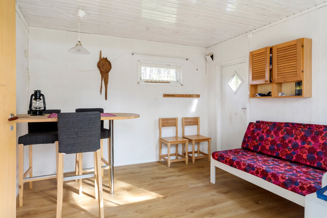 Stugan erbjuder ett rymligt allrum, två sovrum, en sovalkov, kök och toalett. Uppvärmningen sker effektivt med luftvärmepump från 2021, öppen vedspis, samt el-element.