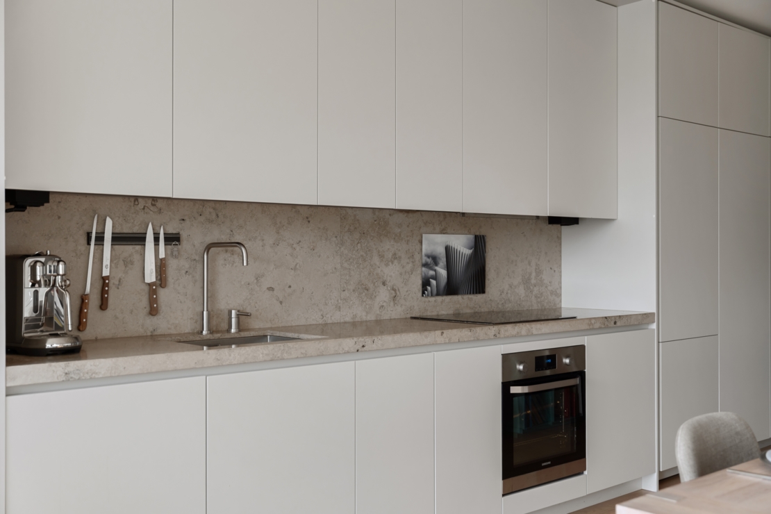 Köket är modernt och stilrent med integrerade vitvaror, gott om arbetsyta och en sober färgskala som harmonierar med den ljusa ekparketten.
