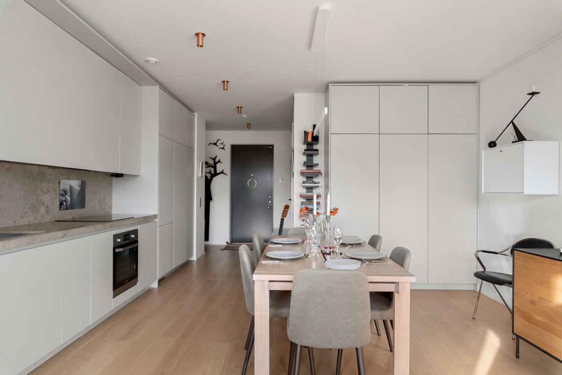 Redan i entrén möts du av en elegant hotellkänsla som följer dig hela vägen in i bostaden. Lägenheten är perfekt planerad med öppna ytor mellan kök och vardagsrum som som skapar en social och harmonisk miljö. Stora fönsterpartier släpper in generöst med ljus och ramar in den magiska utsikten. Här kan du laga middag med utsikt över himlen, duka upp för långa samtal med vänner eller njuta av en lugn frukost med din närmaste i morgonljuset.