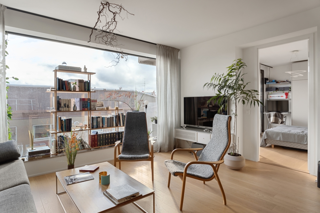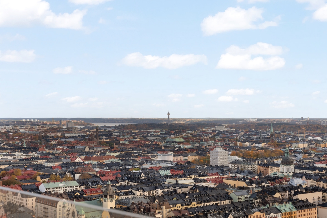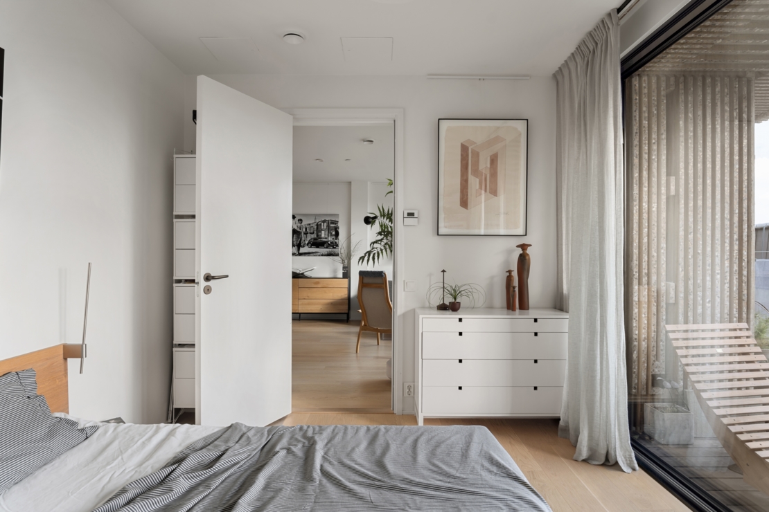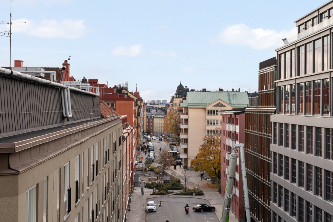 Sovrummet är rofyllt med plats för dubbelsäng och förvaring, och badrummet håller hög standard med golvvärme och tvättpelare dolt bakom stilrena dörrar. Från sovrummet nås balkongen där du kan koppla av ovanför stadens puls. Det är en perfekt plats för att starta dagen med en kopp kaffe eller ett yogapass i det friska, och lika härligt att avsluta kvällen här när himlen färgas rosa över Stockholm.