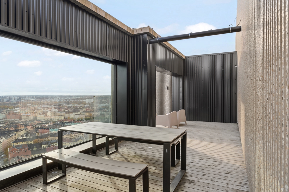 Här bor du med alla bekvämligheter nära till hands. Gym, bastu, biograf, takterrass och övernattningslägenhet finns i huset. Hissen tar dig direkt till garage och förråd.