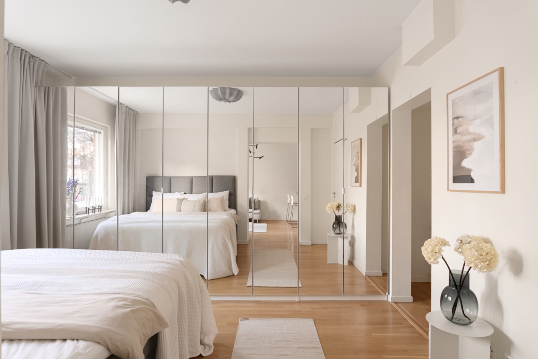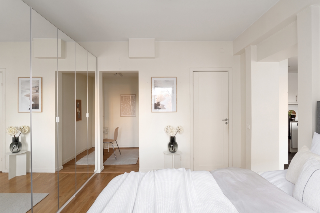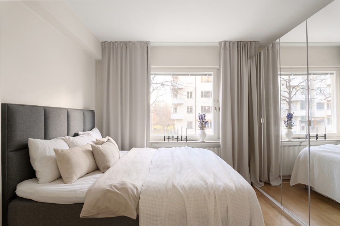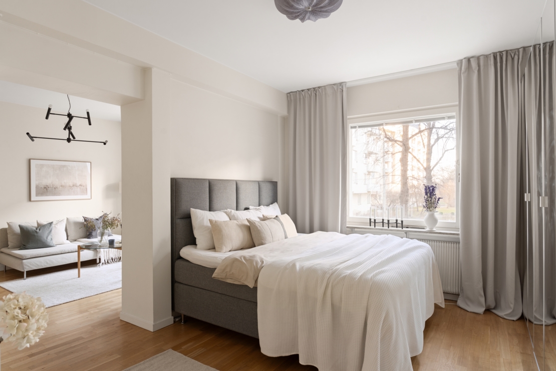 Rogivande sovrum med generös förvaring i praktisk klädkammare. Det stora fönstret ger fint ljusinsläpp och rummet rymmer utan problem en dubbelsäng samt övrig önskad möblering.