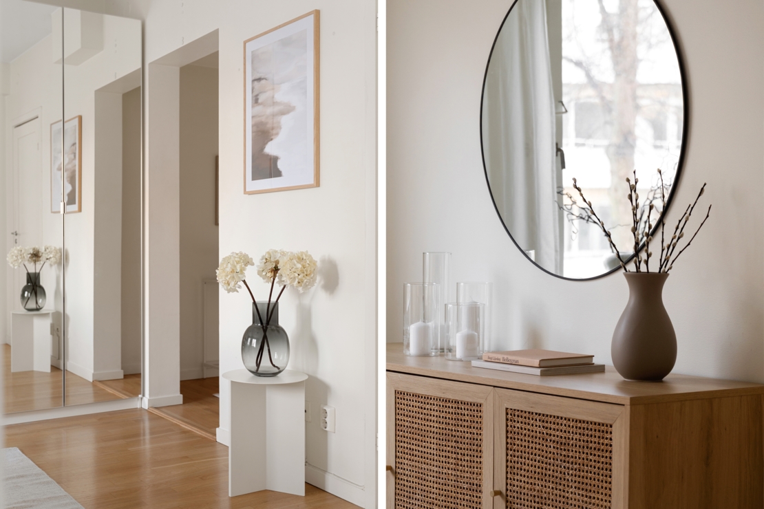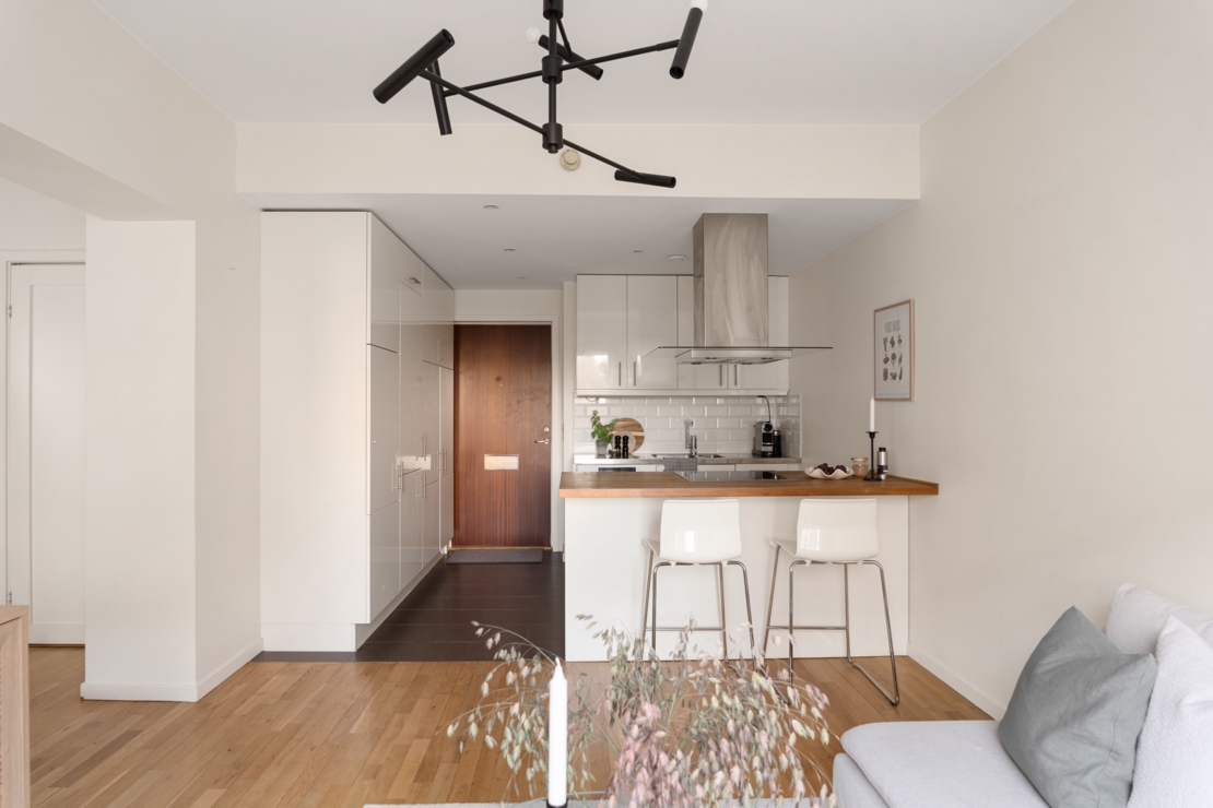 Rymlig och inbjudande hall med klinkergolv och ljusa väggar. Här finns gott om plats för ytterkläder och generös förvaring i de platsbyggda garderoberna. Entrén är utrustad med säkerhetsdörr.