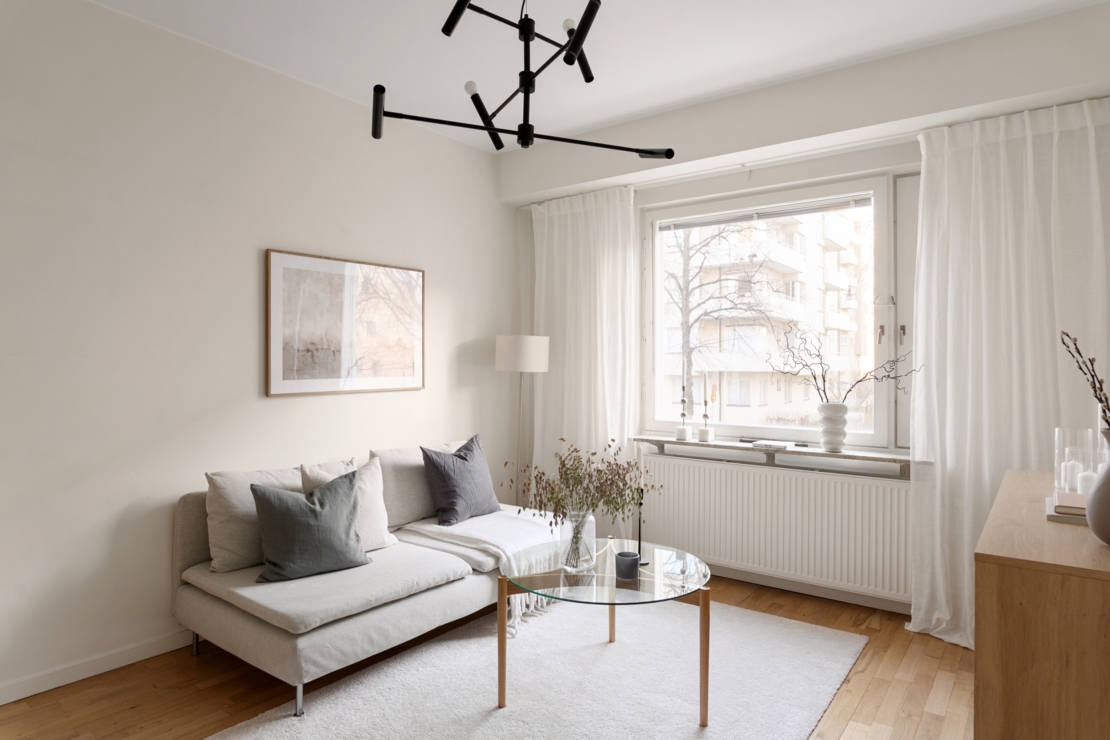 Ljust och rymligt vardagsrum med parkettgolv och vita väggar. Rummet är lättmöblerat och rymmer både soffa, mediabänk och annan önskad inredning. Det stort fönster ger ett generöst ljusinsläpp.