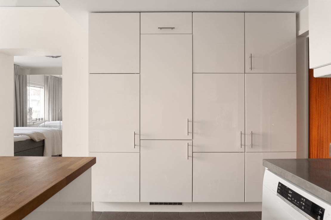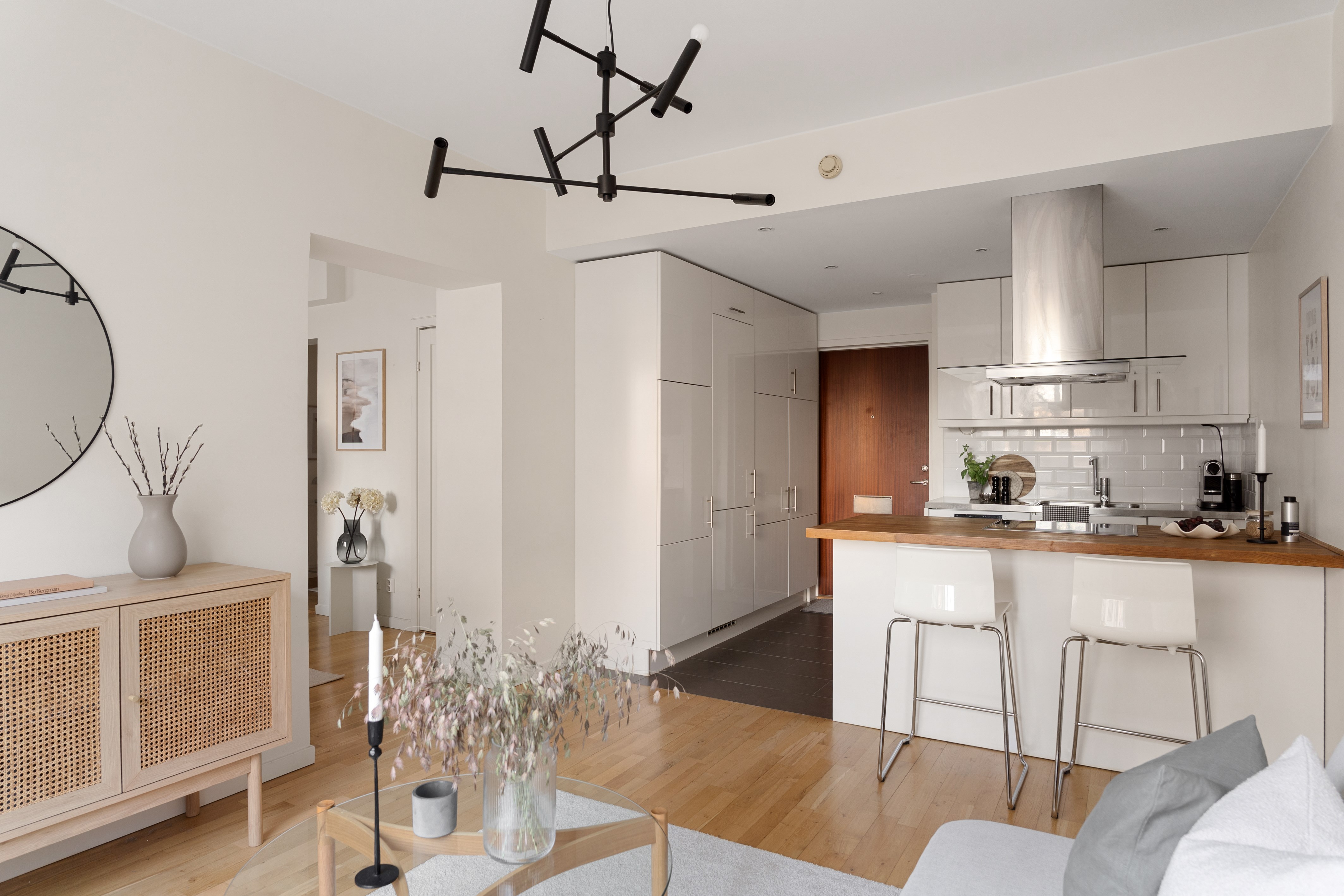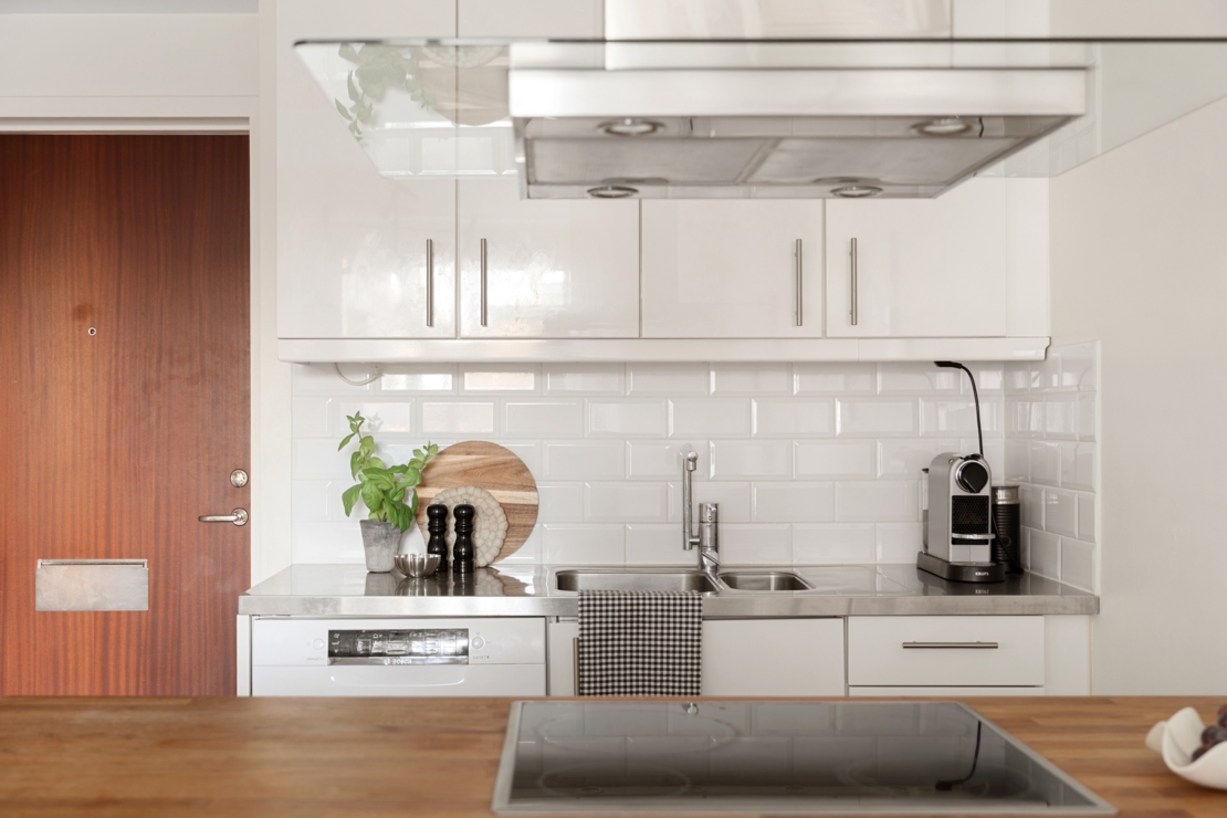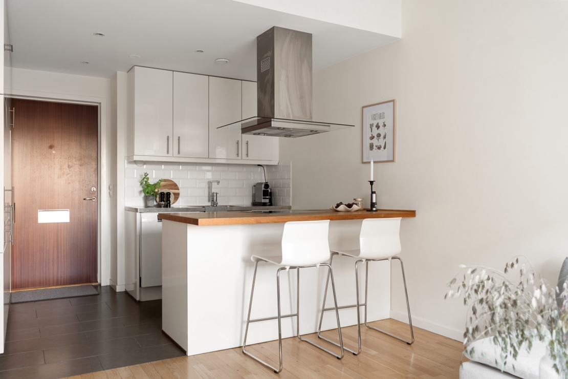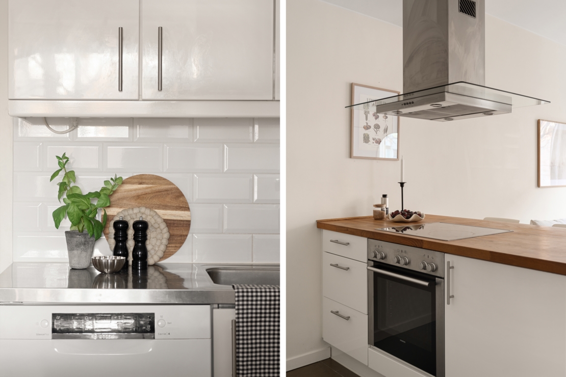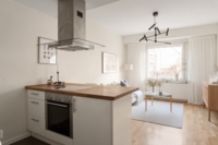 Kök med klinkergolv, ljusa väggar och kaklad yta ovanför arbetsbänken. En köksö öppnar upp mot vardagsrummet och skapar en trevlig, social planlösning. Köket är utrustat med spis, fläkt, ugn, diskmaskin samt kyl och frys. Köksön erbjuder även barbordsyta med sittplatser.