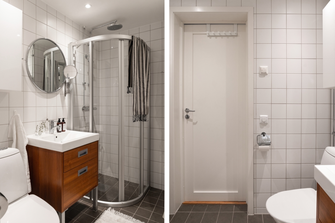 Stilrent och funktionellt badrum med ljust klinkergolv och helkaklade väggar. Rummet är utrustat med wc, handfat, kommod med praktisk förvaring, spegel, dusch med glasväggar samt ett extra förvaringsskåp. Här finns även både tvättmaskin och torktumlare för extra bekvämlighet.