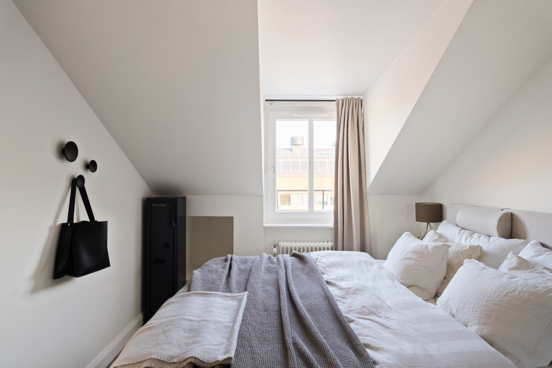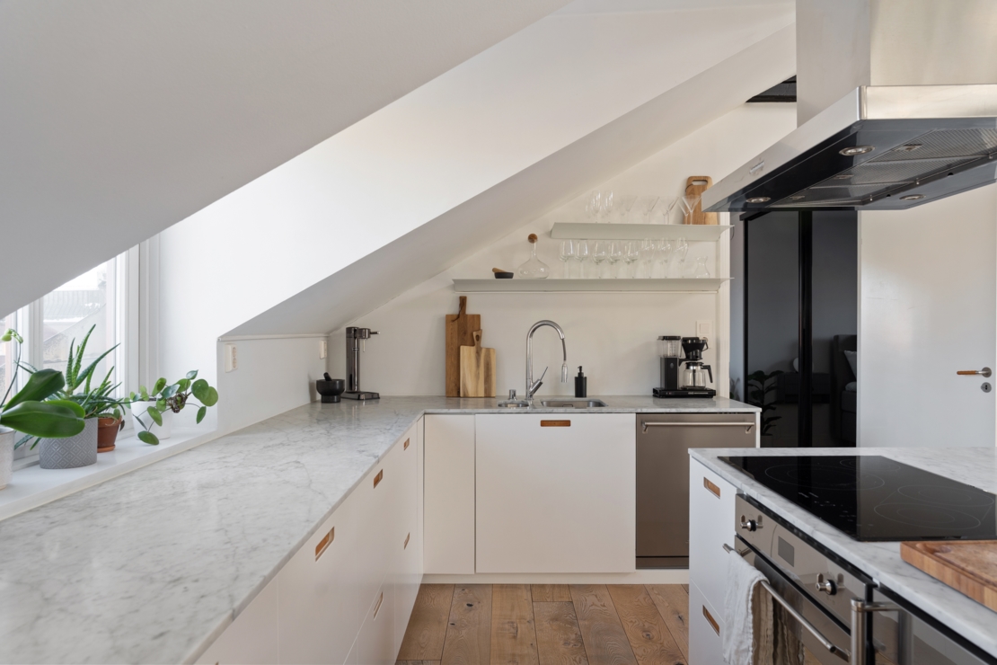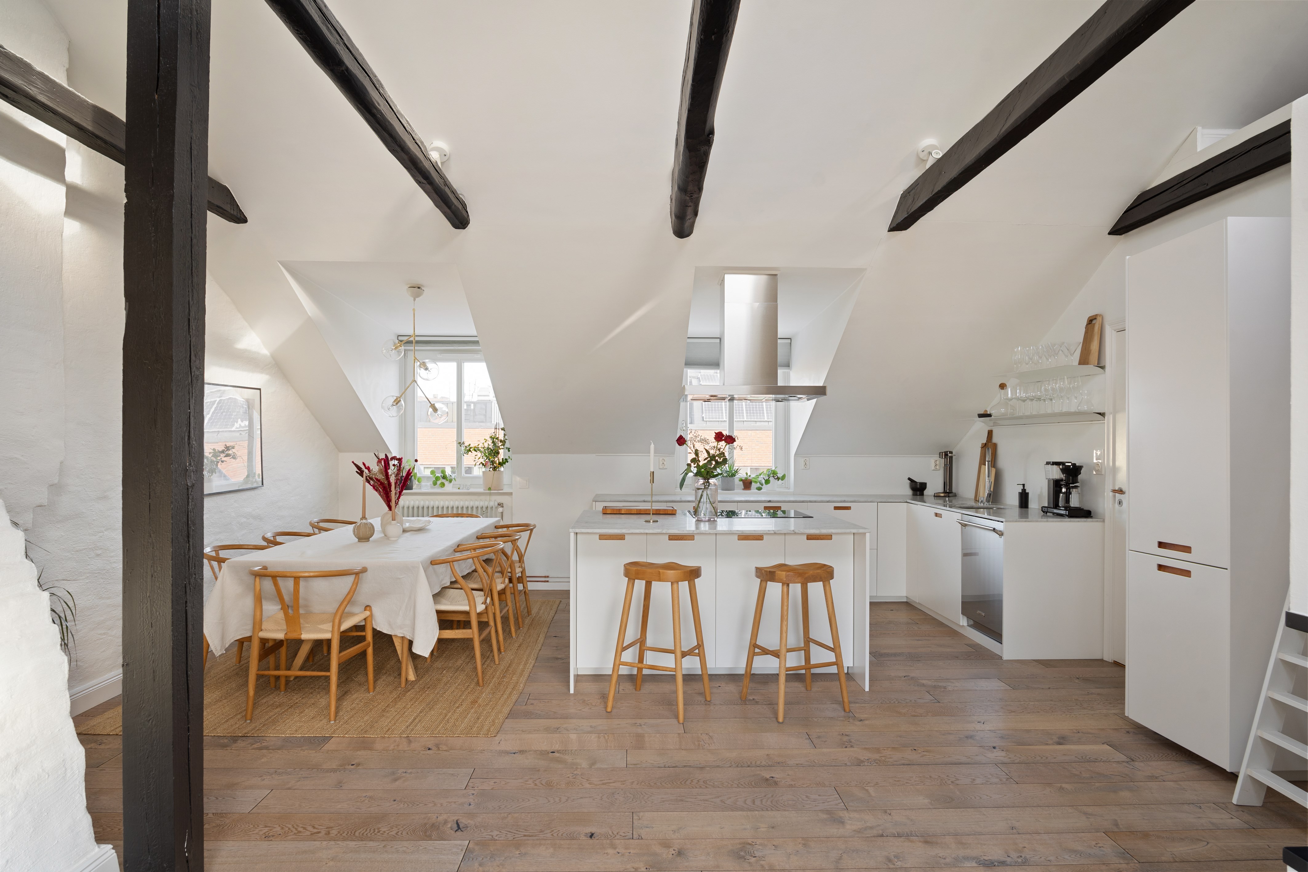 Högst upp i ett vackert 1900-talshus väntar ett hem där ljus, rymd och noggrant utvalda material samspelar i en genomgående exklusiv helhet. Planlösningen är lika smart som elegant: generösa sociala ytor där vardagsrum och kök möts naturligt, samtidigt som sovrummen ligger avskilt för lugn och återhämtning.