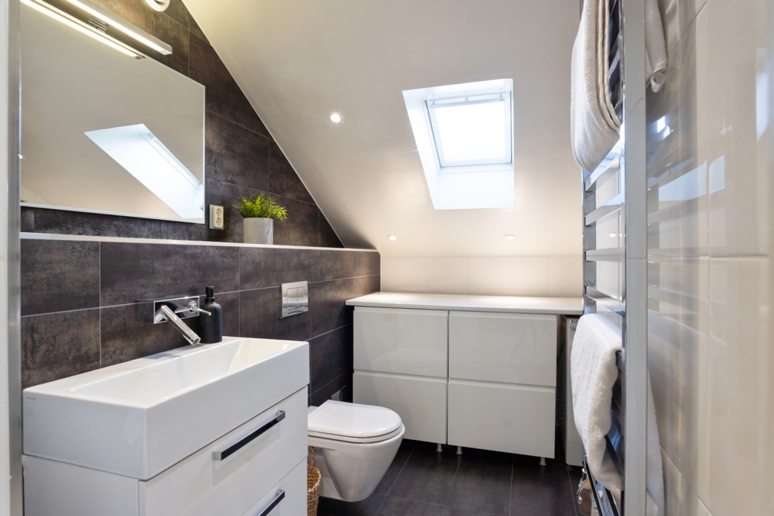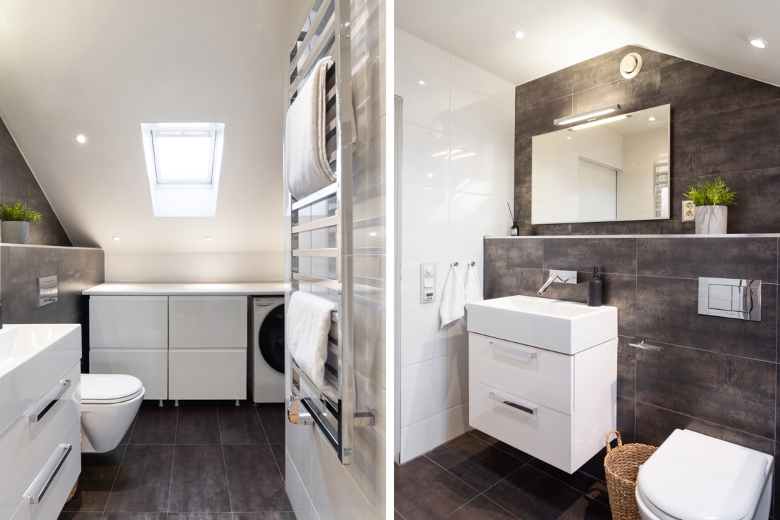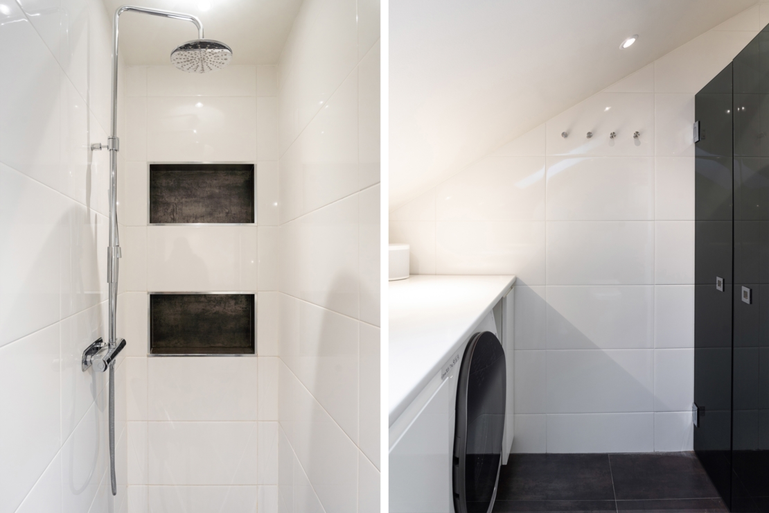 Badrummet har fina kontraster och är fullt utrustat med tvättmaskin och en platsbyggd dusch.