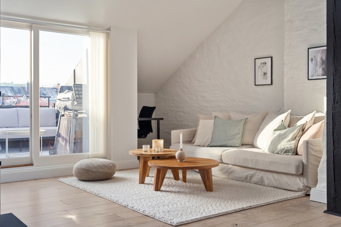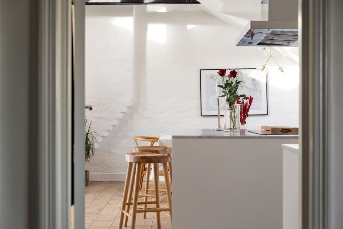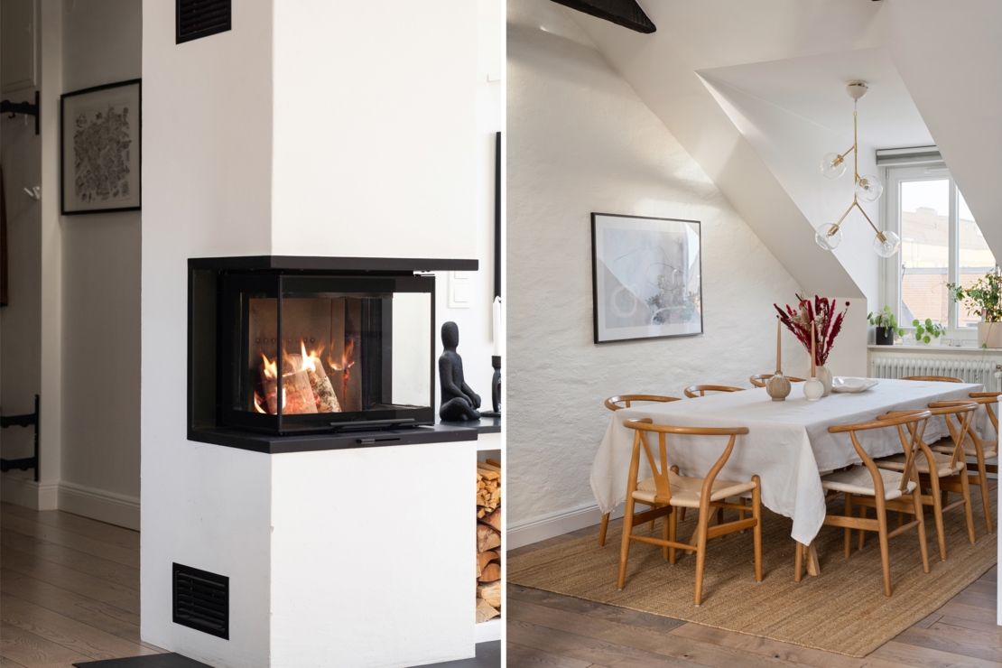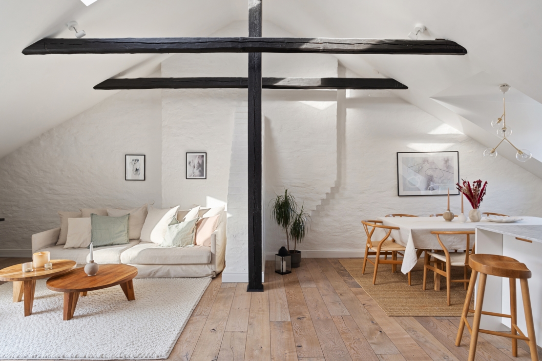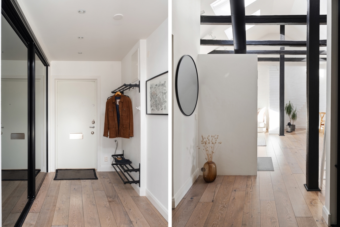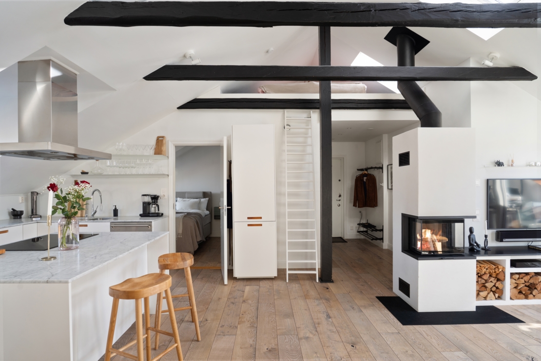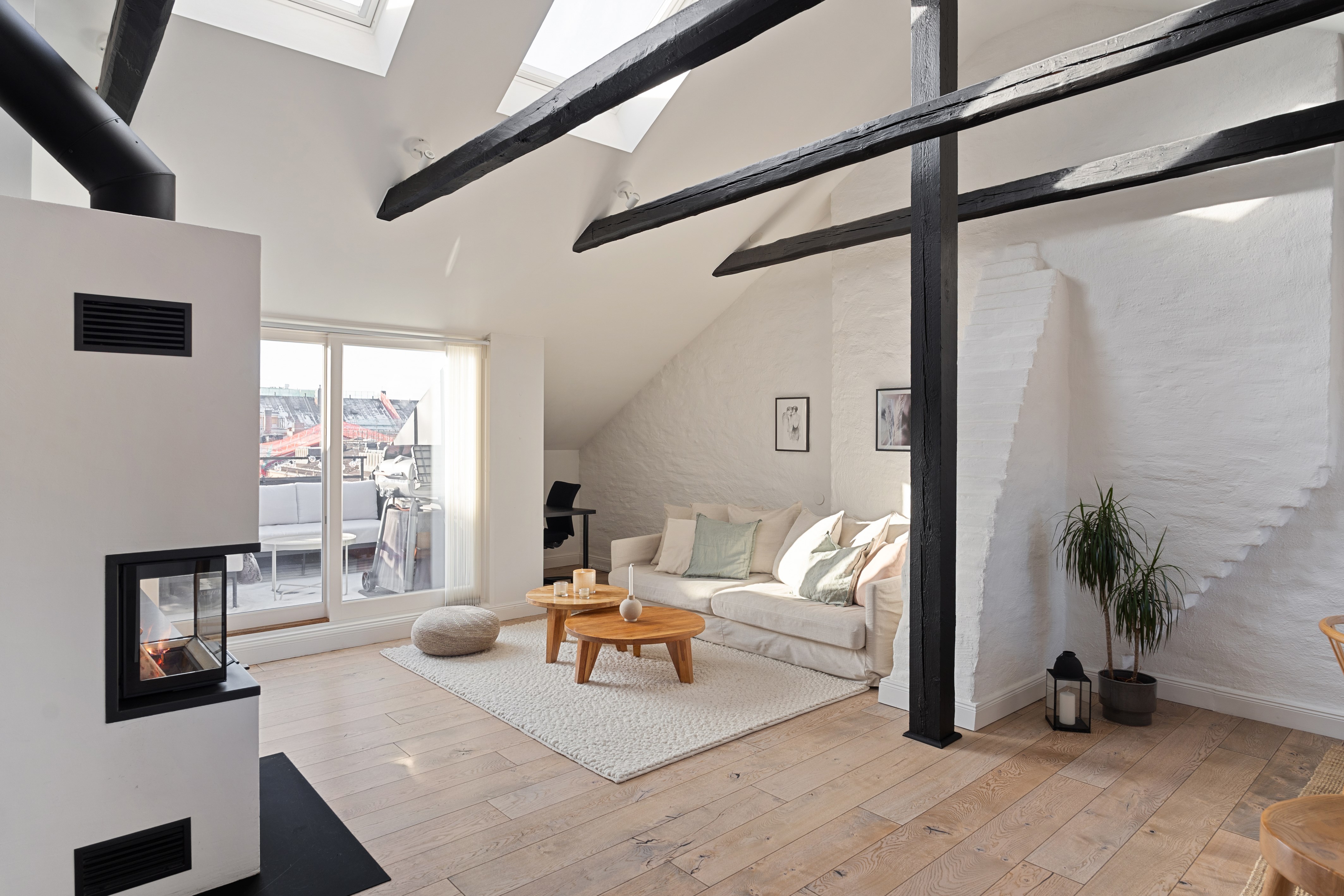 Genom hela bostaden löper ett enhetligt, ljust och exklusivt golv som binder ihop rummen och skapar en sofistikerad hotellkänsla. Vackra träbalkar längs taken ger bostaden en svårslagen karaktär. Generösa fönsterpartier och takfönster skapar ett fantastiskt ljusinsläpp och förstärker den luftiga känslan, samtidigt som elektriska mörkläggningsgardiner gör det enkelt att styra både integritet och atmosfär. Samtliga takfönster är dessutom öppningsbara för smidig ventilation.