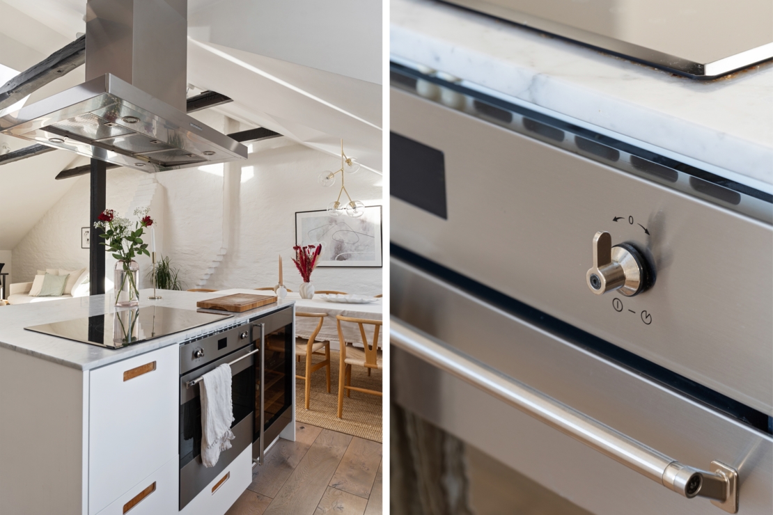 Köket är genomtänkt in i minsta detalj och utstrålar modern lyx med stilren design och Smeg-vitvaror. Den generösa köksön gör det enkelt att umgås samtidigt som maten lagas. Pricken över i:et är den exklusiva kökskranen i restaurangstil med utdragbar slang, en detalj som både lyfter uttrycket och gör vardagen märkbart bekvämare. Här finns plats för en rejäl matgrupp med minst sex sittplatser, perfekt för långa middagar.