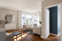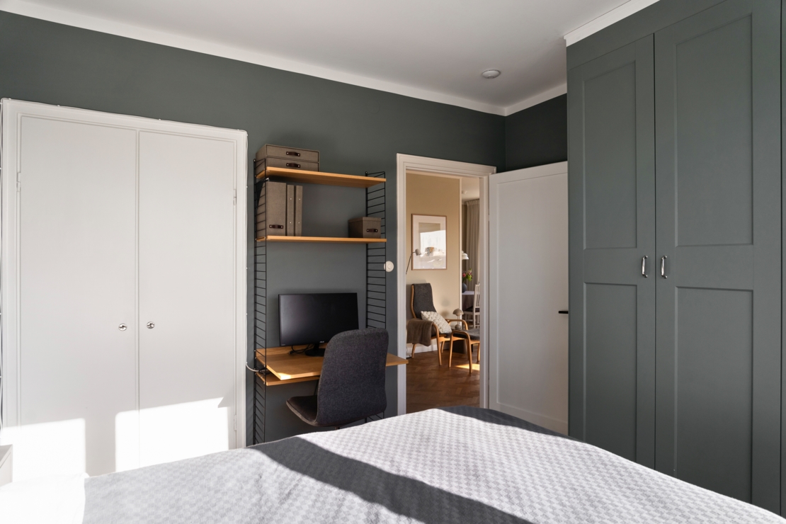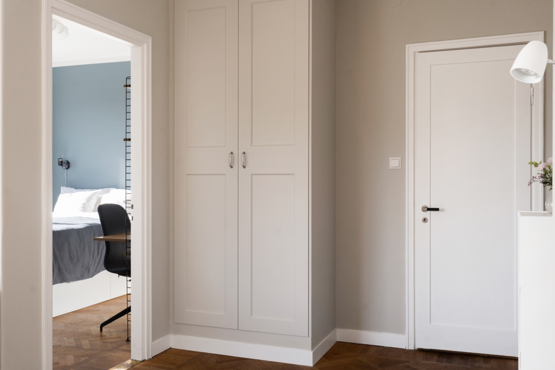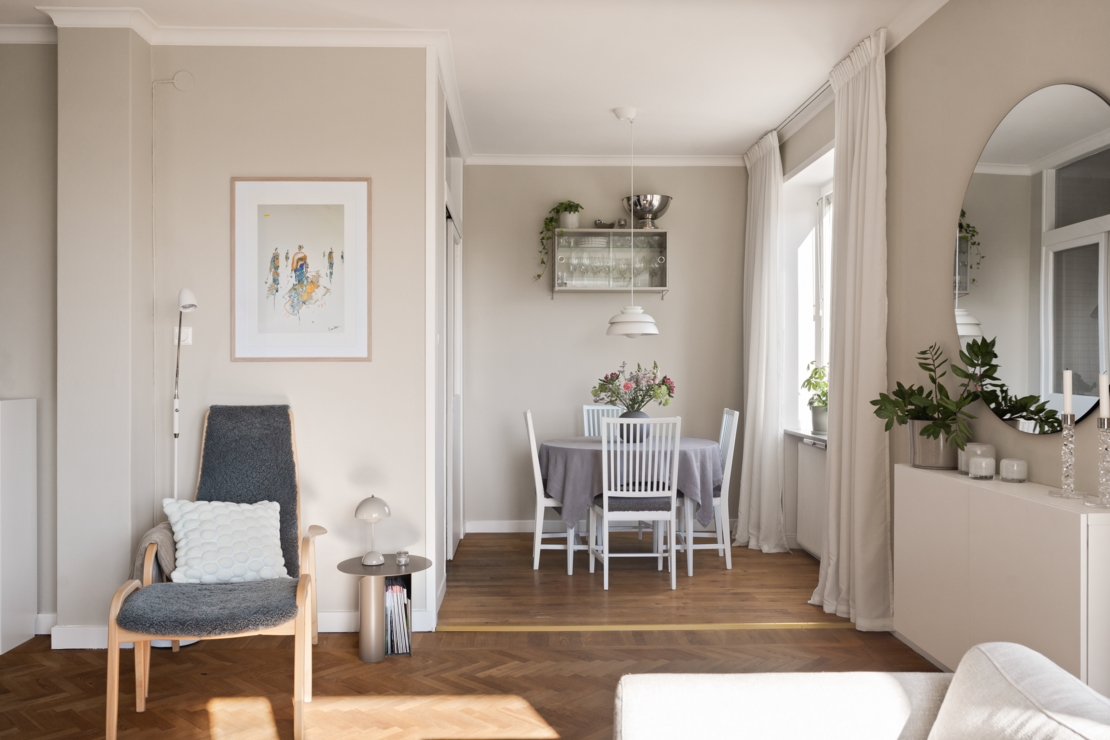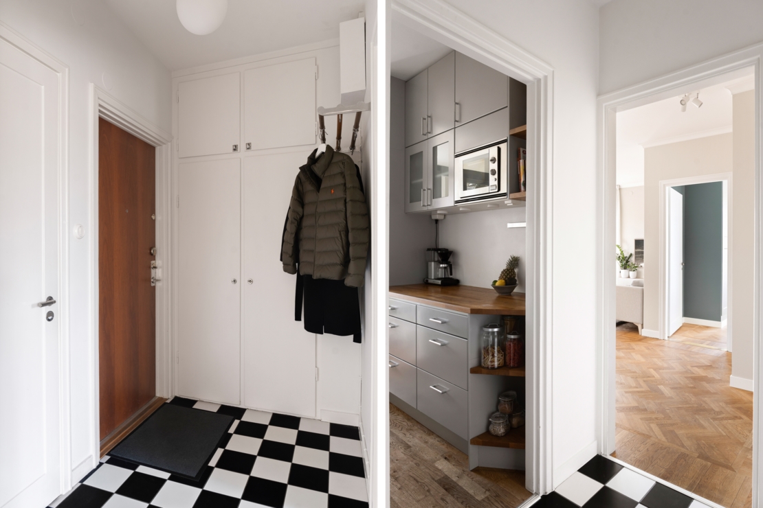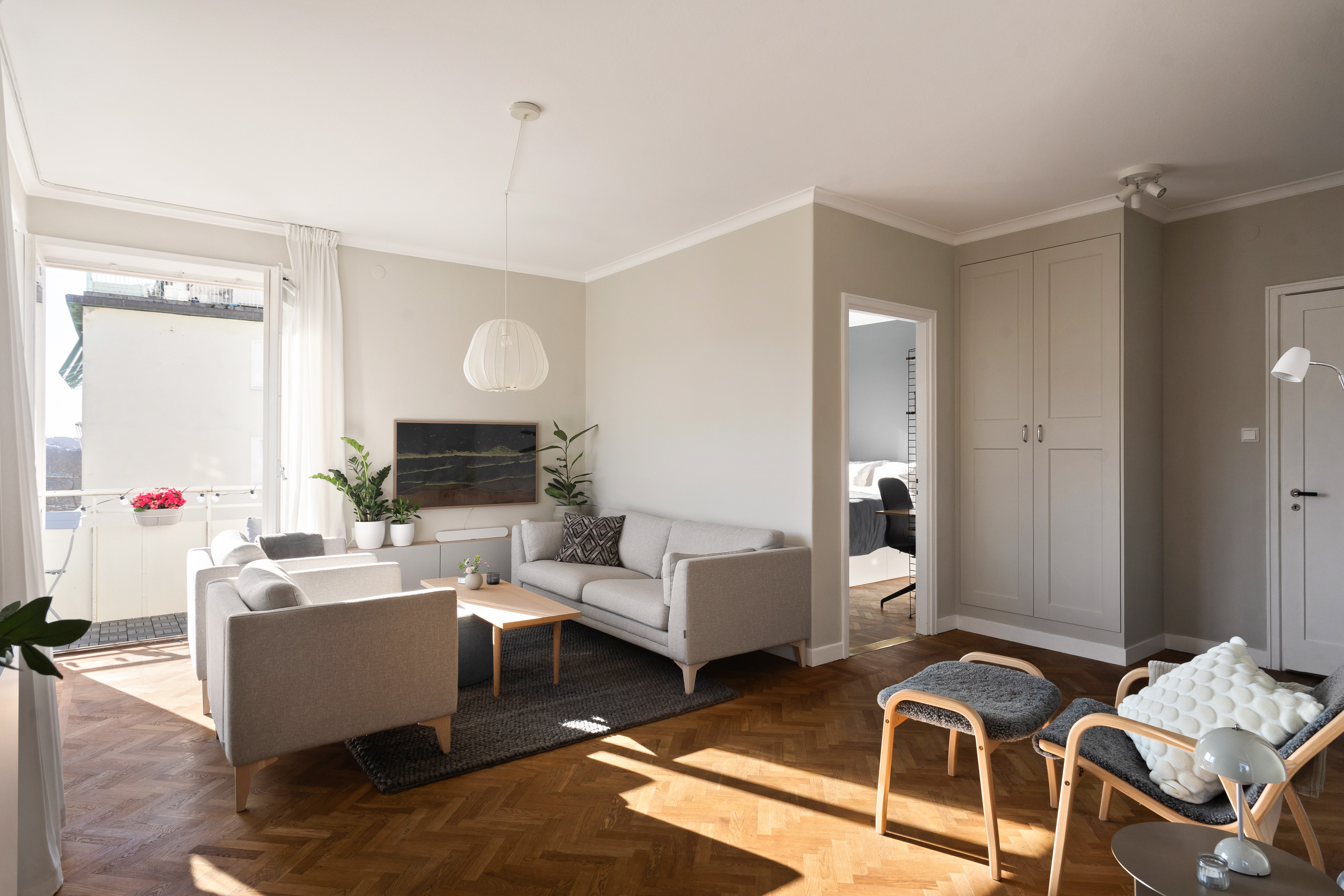 Här möts ni av en välkomnande hall med gott om platsbyggd förvaring som gör det enkelt att hålla ordning. Vardagsrummet är generöst tilltaget och utgör en naturlig plats för middagar med vänner, mysiga filmkvällar eller en spontan brunch med familjen. Här rymms plats för både en större loungegrupp samt ett rymligt middagsbord. Med fönster i två väderstreck flödar ljuset in och skapar en varm och inbjudande atmosfär hela dagen. Från vardagsrummet nås den fantastiska balkongen i soligt söderläge, en given plats för en kaffe i morgonsolen och sena sommarkvällar. Sovrummet är rofyllt och generöst, med platsbyggd förvaring och en avkopplande känsla. Bostaden har en separat wc, och ett badrum utrustat med bland annat tvättmaskin för en bekväm vardag.