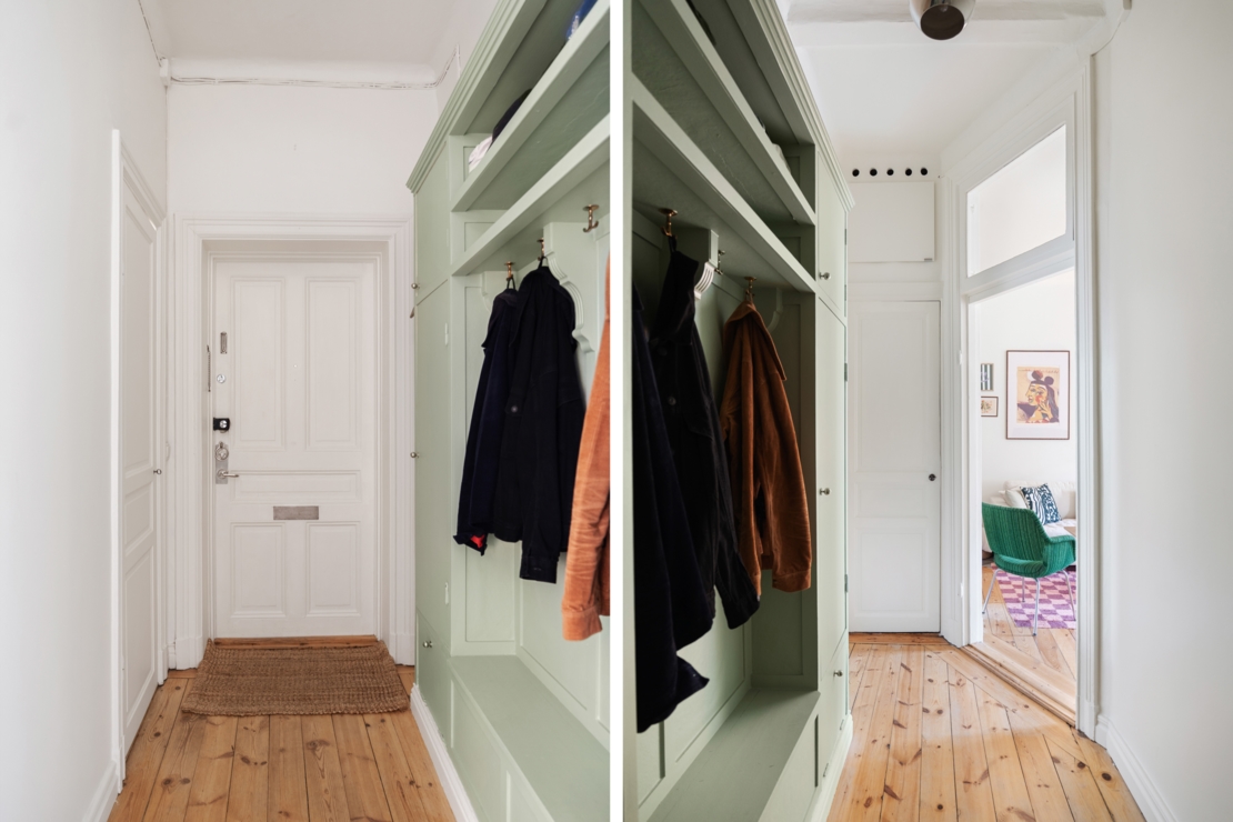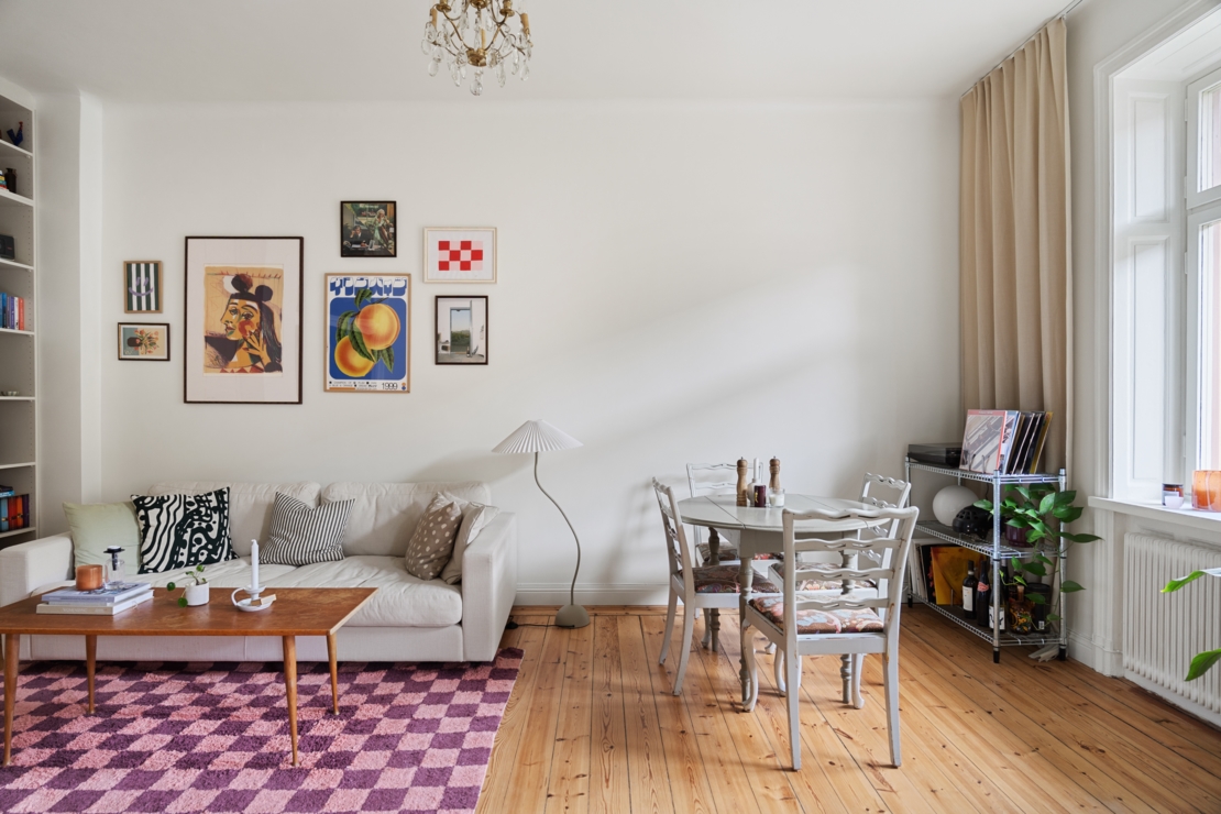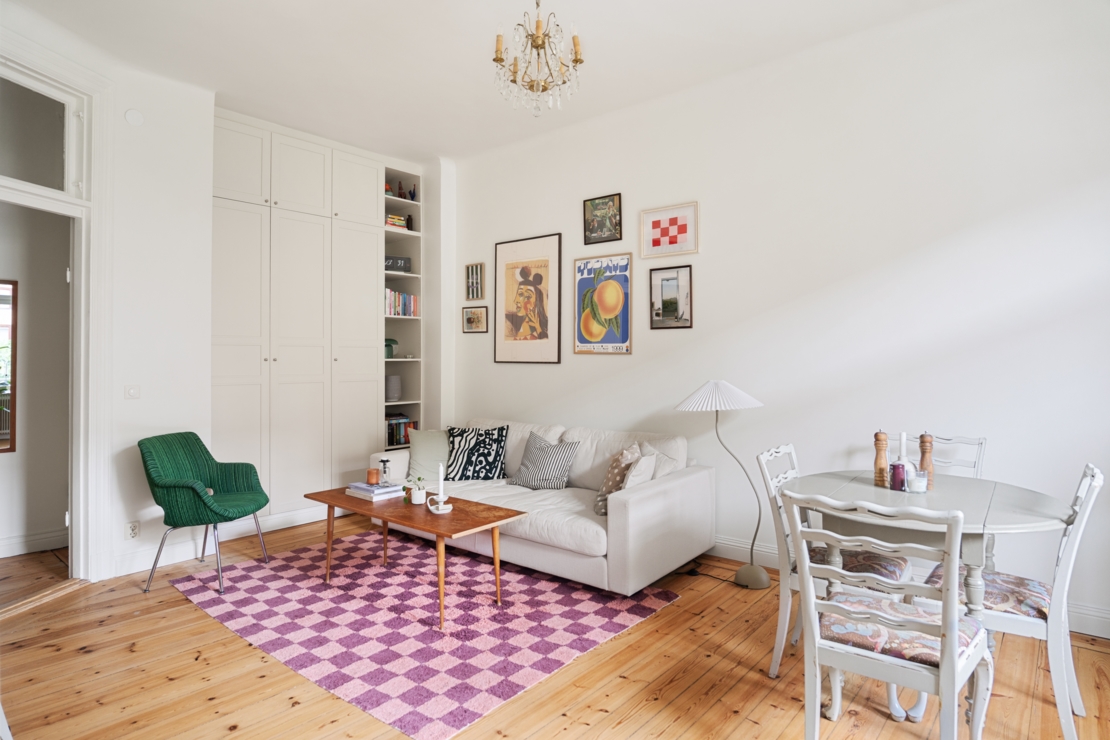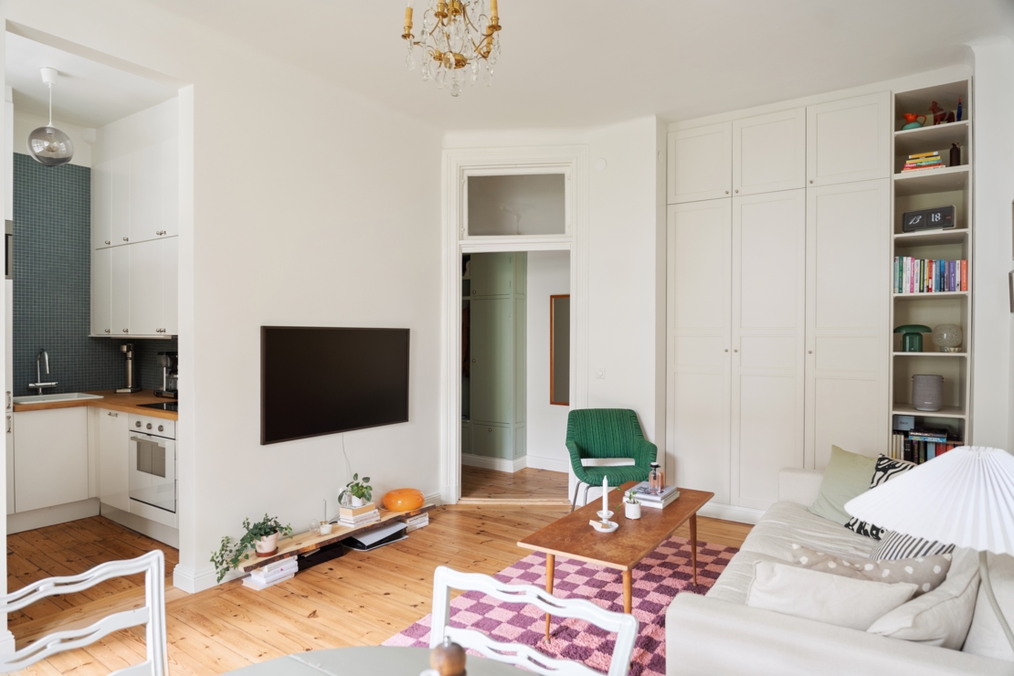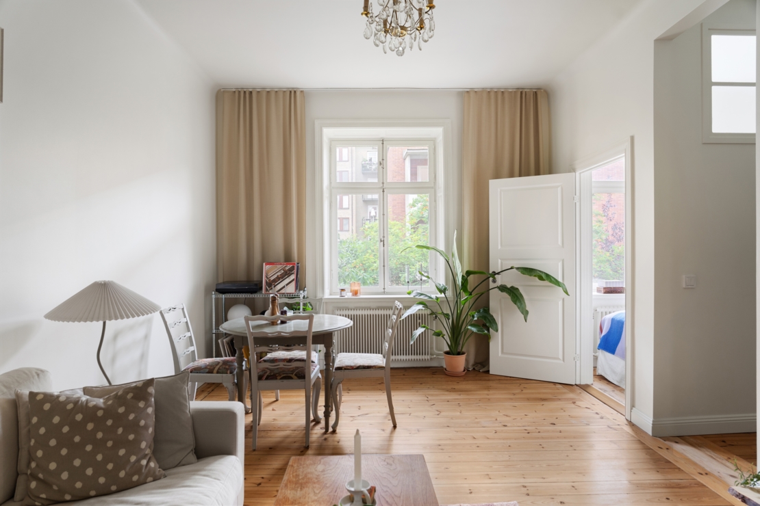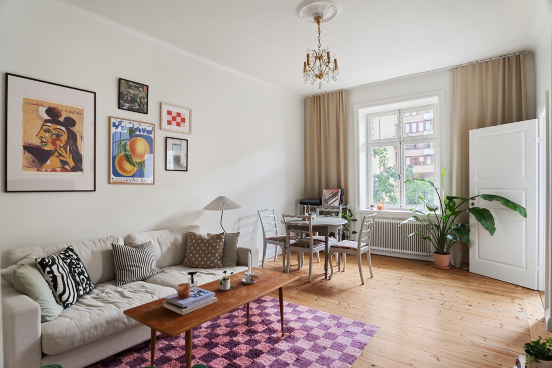 Lägenheten är smakfullt renoverad med en väl genomtänkt planlösning. Här möts du av en harmonisk atmosfär, ljusa kulörer, vackra trägolv och genomgående smarta lösningar. I hallen finns gott om förvaring. Vardagsrummet är luftigt och inbjudande, med en platsbyggd hylla, och plats både soffgrupp och matgrupp. Här finns med andra ord gott om utrymme för att umgås med vänner och familj, perfekt för både mysiga kvällar och sociala middagar. De stora fönstren ger ett härligt ljusflöde och förstärker känslan av rymd.