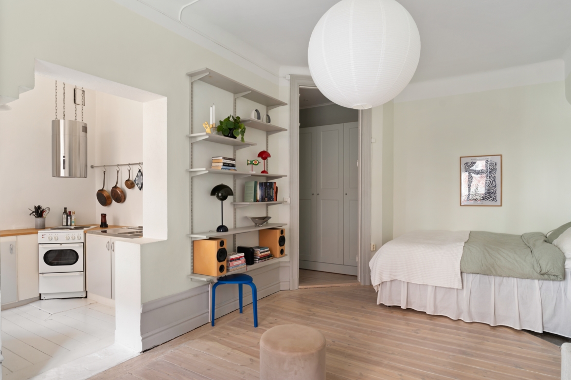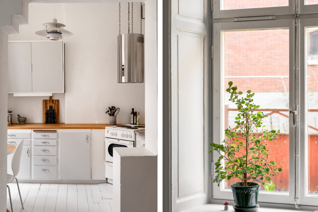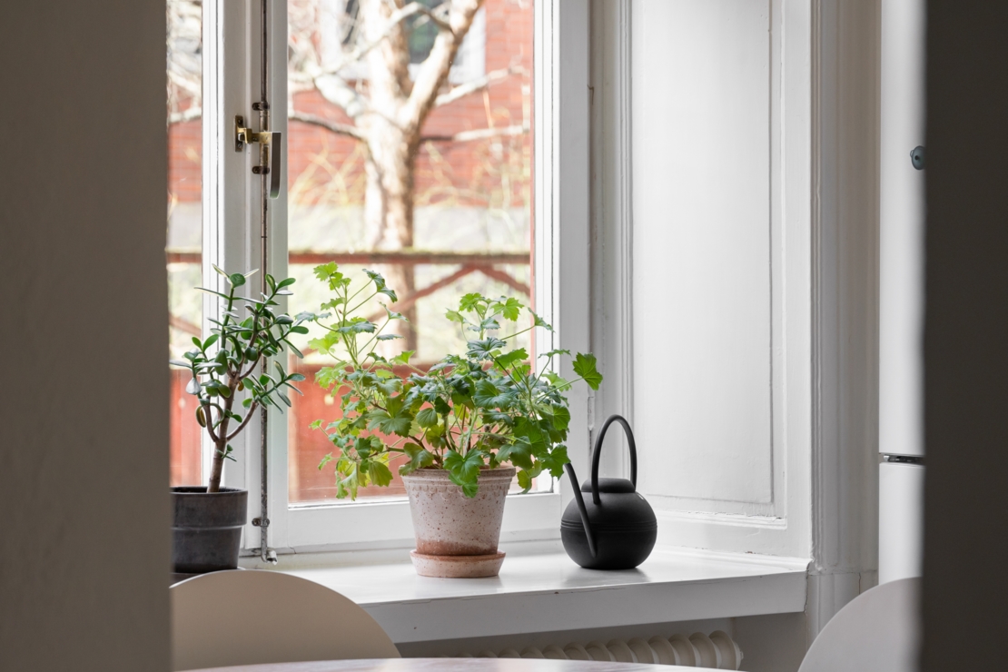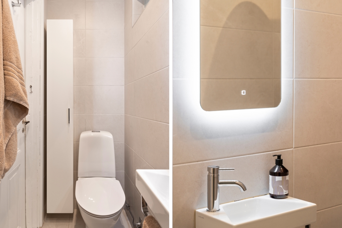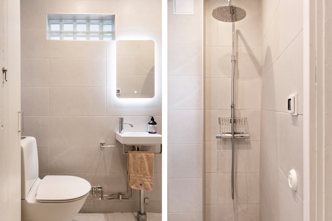 Det separata köket ligger i anslutning till allrummet och är både charmigt och funktionellt. Här erbjuds generösa arbetsytor, god förvaring och en trivsam matplats vid fönstret, en självklar samlingspunkt för långfrukostar, middagar med vänner eller en lugn morgon med kaffekoppen i handen. Badrummet är smakfullt renoverat i sobra, moderna toner med stilrena materialval.