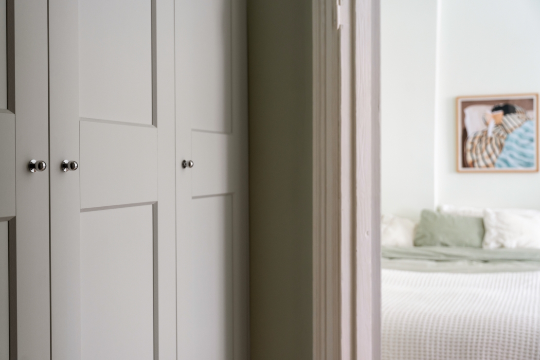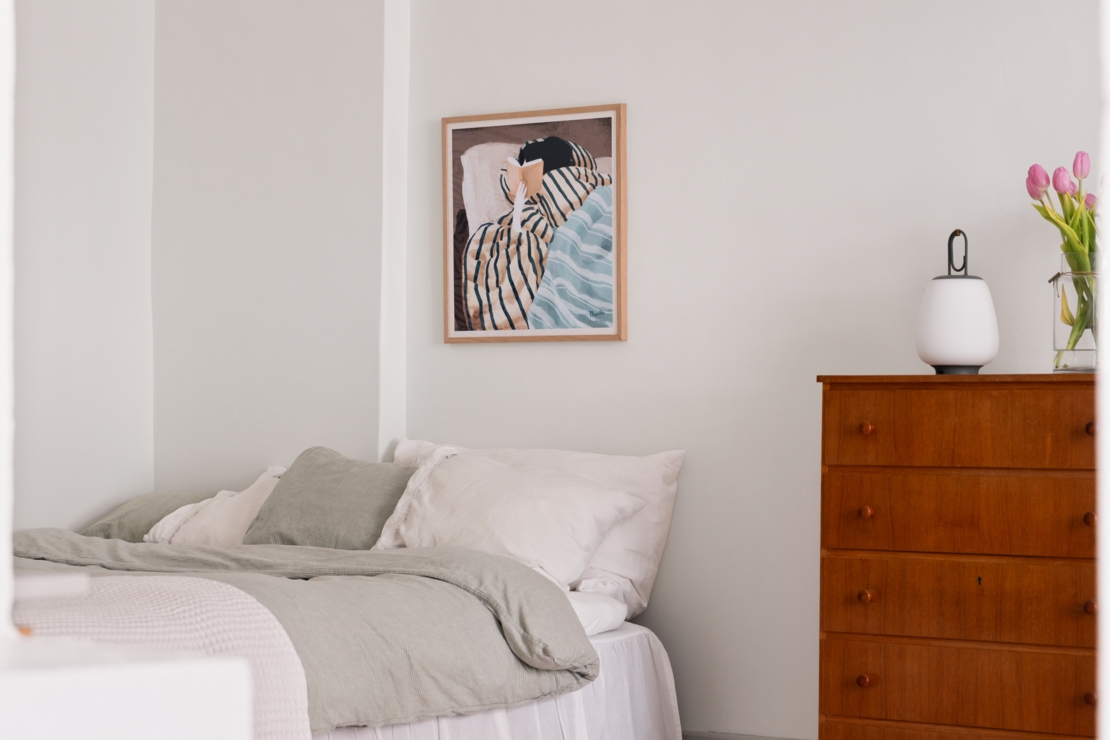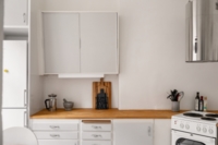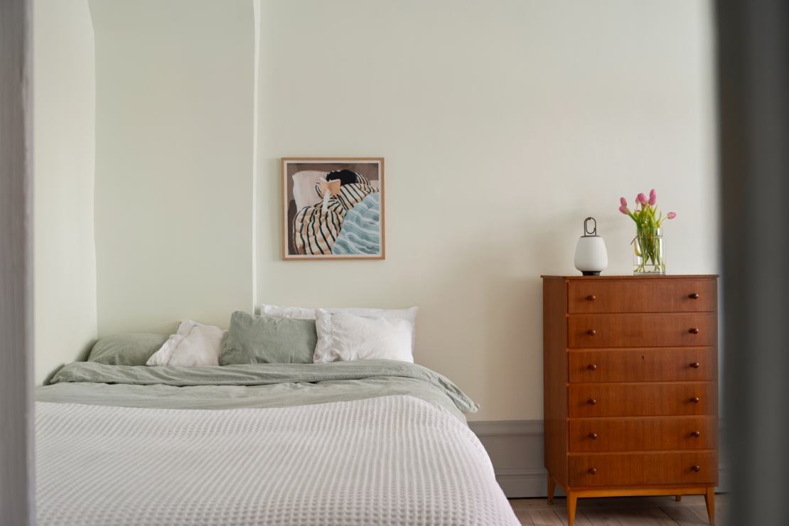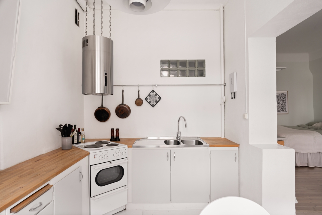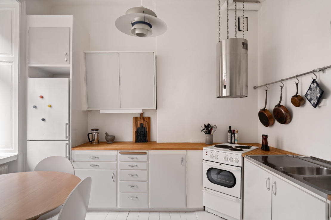 Det separata köket ligger i anslutning till allrummet och är både charmigt och funktionellt. Här erbjuds generösa arbetsytor, god förvaring och en trivsam matplats vid fönstret, en självklar samlingspunkt för långfrukostar, middagar med vänner eller en lugn morgon med kaffekoppen i handen. Badrummet är smakfullt renoverat i sobra, moderna toner med stilrena materialval.