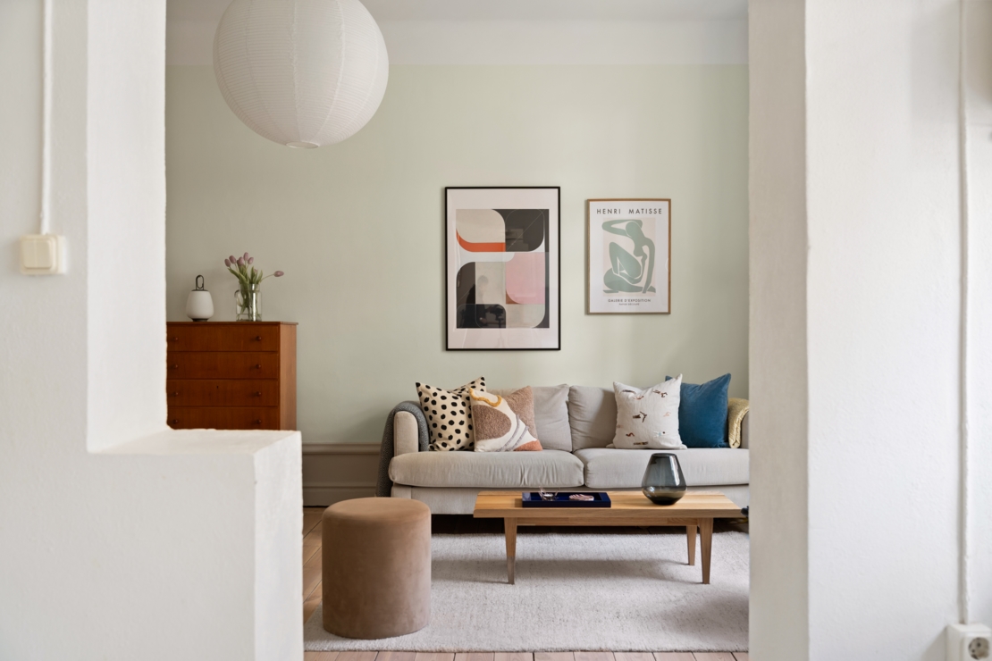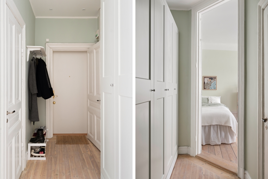Redan i hallen möts du av en varm och genomtänkt färgsättning, klassiska spegeldörrar, generösa förvaringslösningar och vackra trägolv som löper enhetligt genom bostaden. Här infinner sig omedelbart en känsla av kvalitet, omsorg och tidlös elegans.
