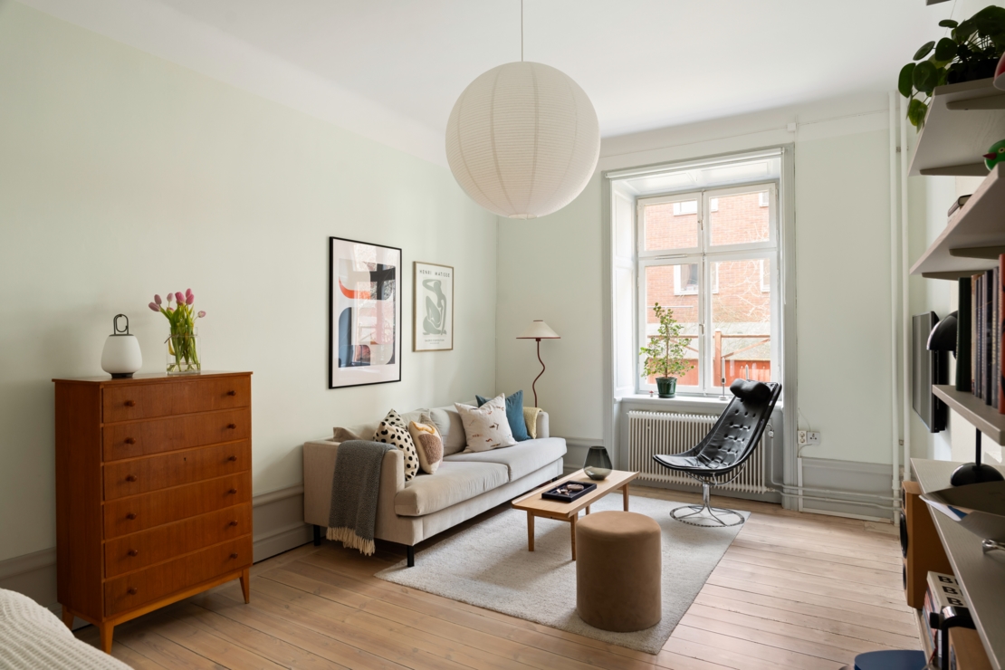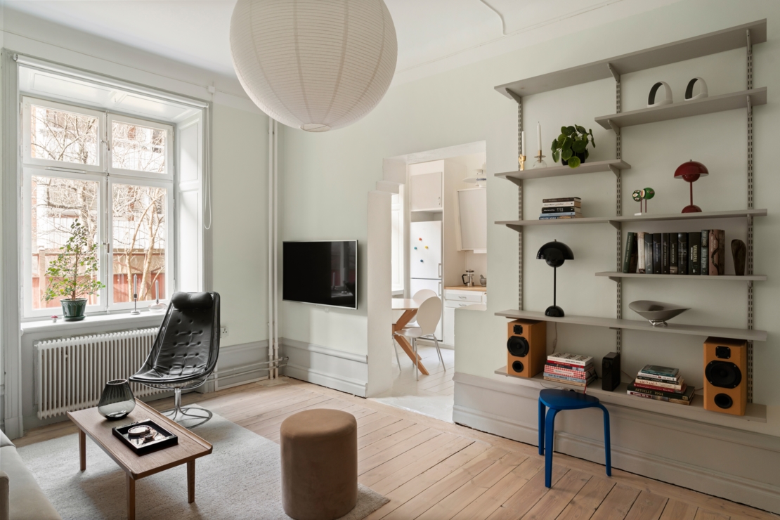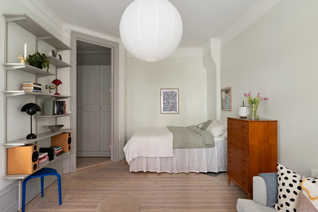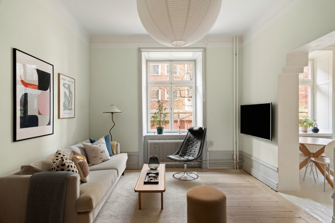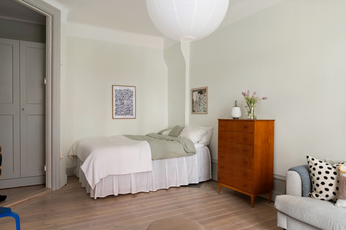 Vardagsrummet är hemmets självklara mittpunkt, ett luftigt och inbjudande rum med storslagen takhöjd och stora fönster som låter dagsljuset flöda in. Djupa fönsternischer, gedigna lister och sekelskiftesdetaljer ramar in rummet och förstärker den historiska charmen. Här finns gott om plats för en fullstor soffgrupp och en rymlig sovdel, med möjlighet att skapa en naturlig och stilfull uppdelning mellan umgänge och vila.