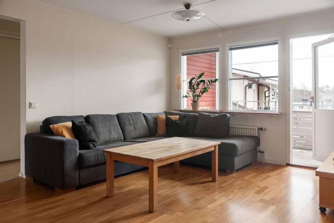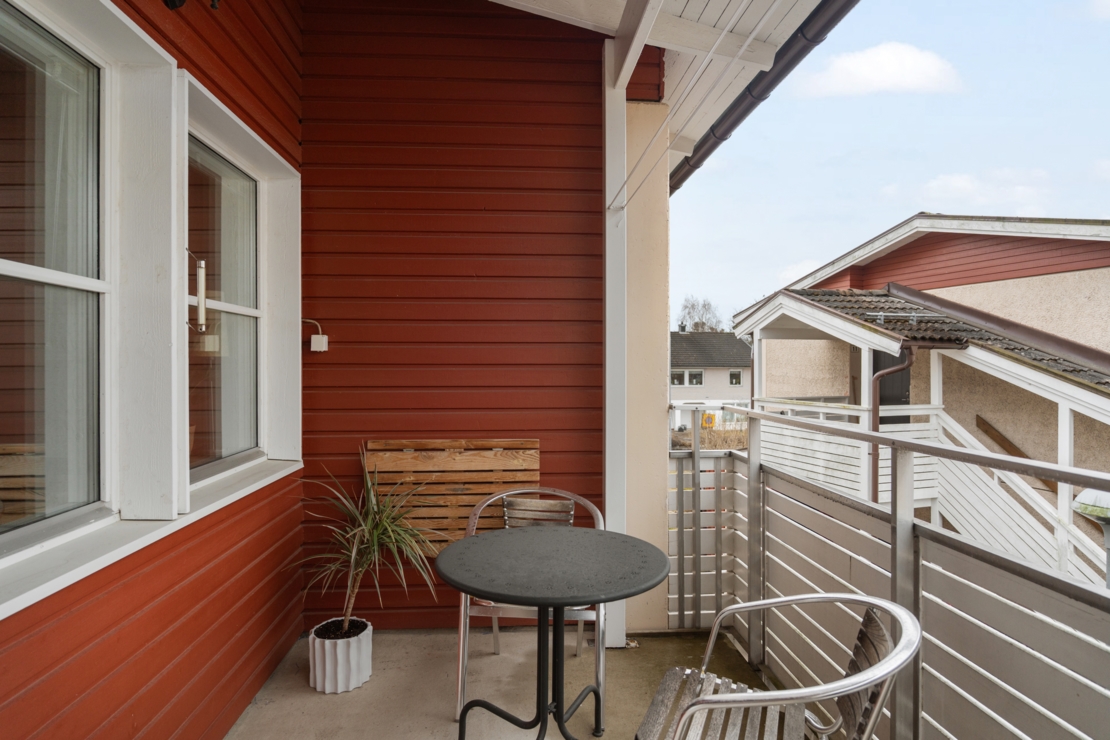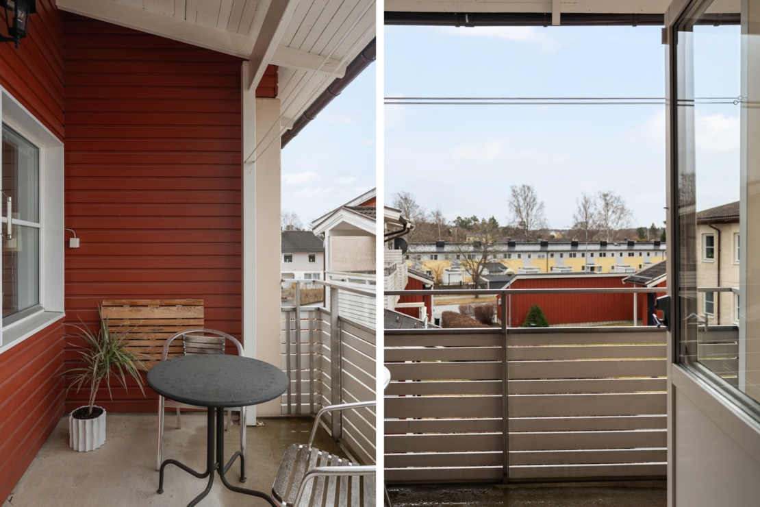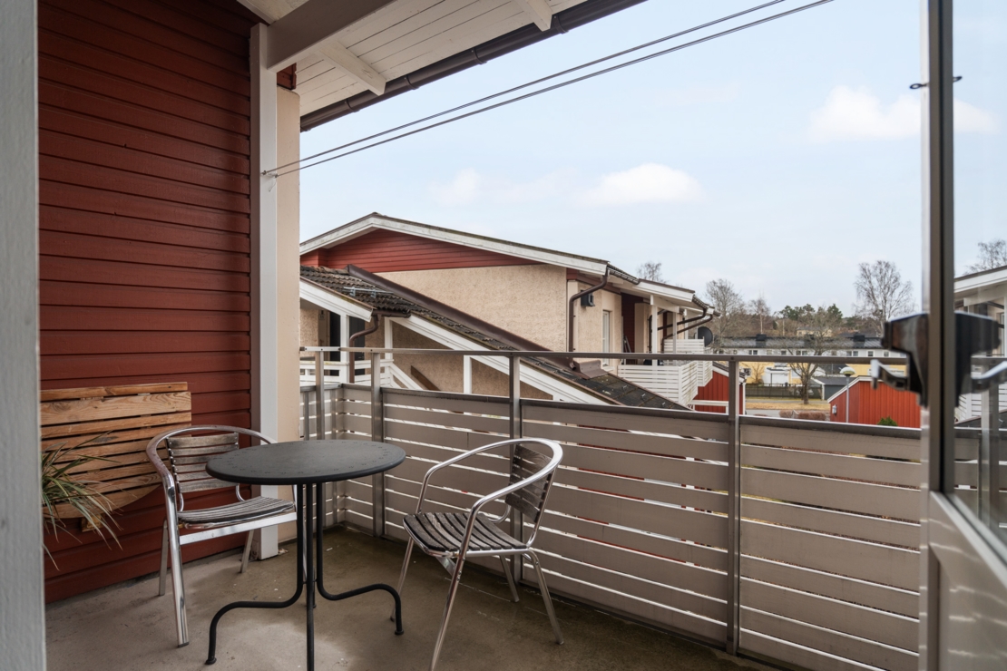 Från vardagsrummet nås den stora balkongen i härligt sydläge som erbjuder många soltimmar – en perfekt plats att njuta av solen från vår till sen kväll.