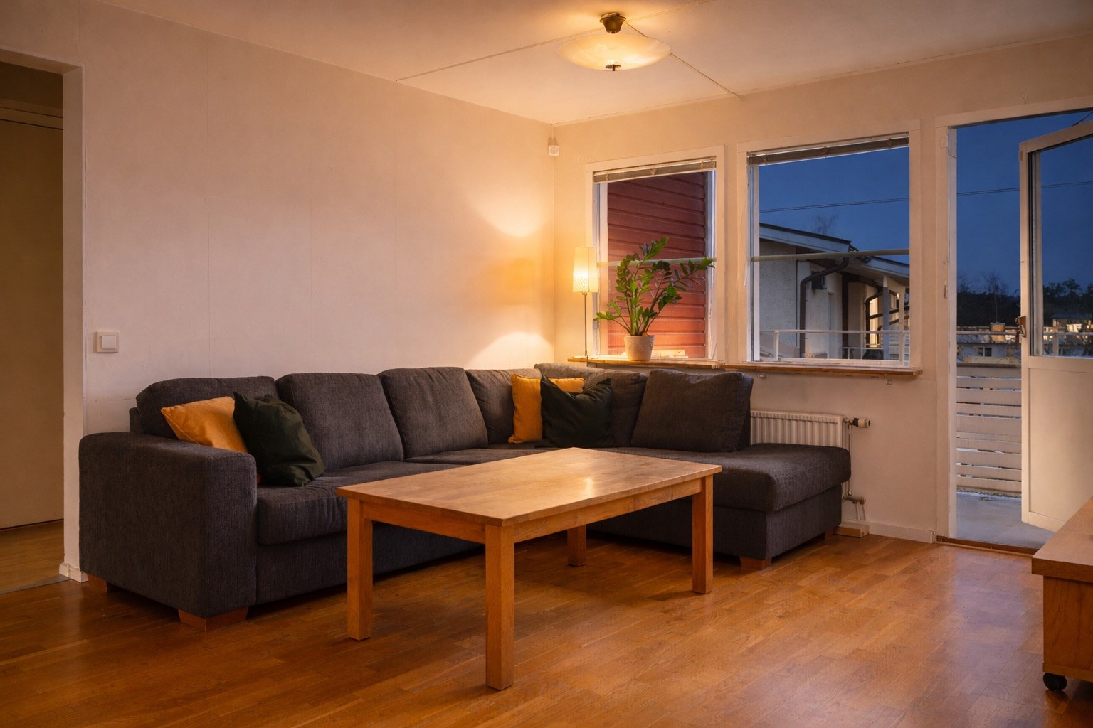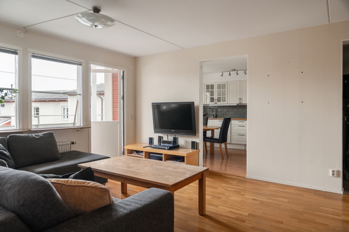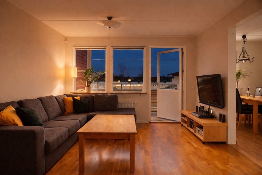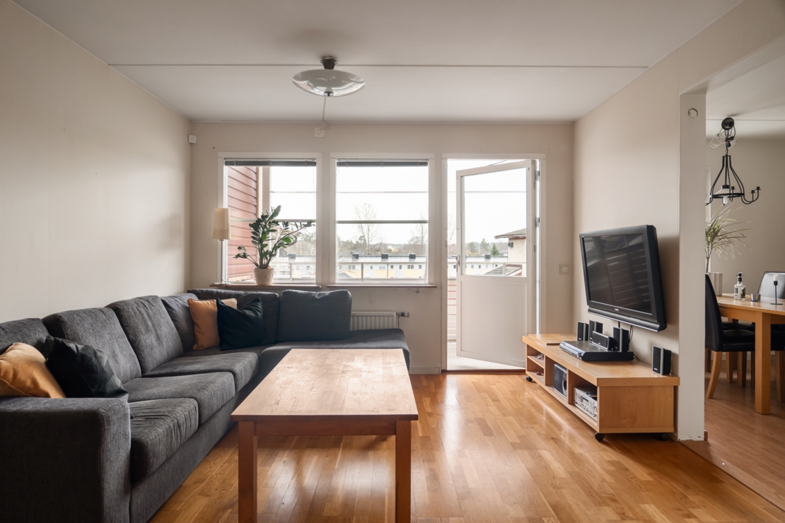 Från vardagsrummet nås den stora balkongen i härligt sydläge som erbjuder många soltimmar – en perfekt plats att njuta av solen från vår till sen kväll.