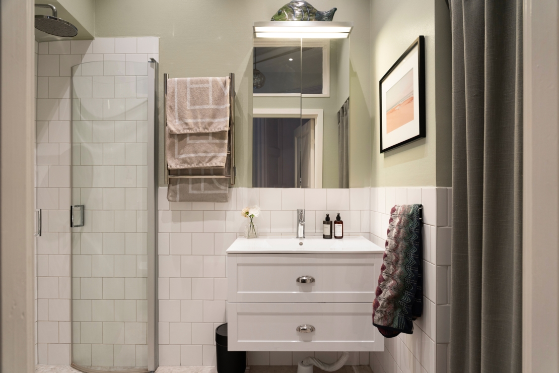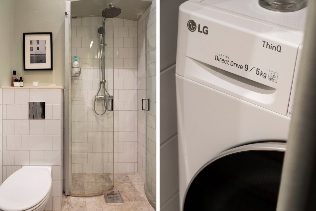 Badrummet är fräscht och stilrent med egen tvättmöjlighet, en lyxig bekvämlighet som förenklar vardagen ytterligare.